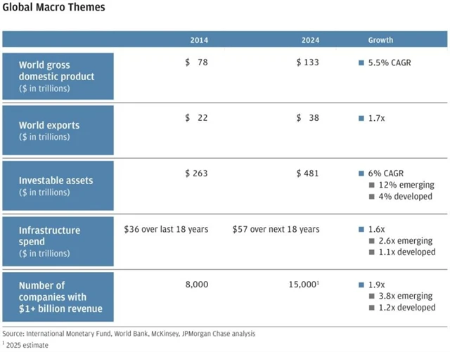 Globální HDP i export by v roce 2024 měly být o 70 % mohutnější a na světě bude téměř dvakrát více firem, které za rok budou schopny vykázat tržby přes miliardu dolarů. Výrazně porostou také výdaje na infrastrukturu, v rozvíjejících se zemích pochopitelně výrazně více.