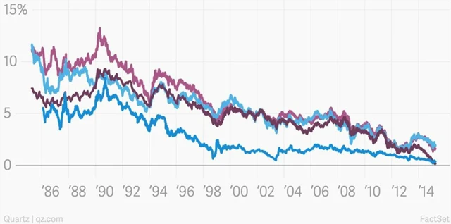To, co je na jednu stranu pro světovou ekonomiku spásou, je ale na druhou stranu také pořádně těžkým balvanem. Úrokové sazby, které ukazují, jak velkou část jistiny musí dlužník zaplatit, aby od věřitele získal potřebnou půjčku, lze považovat za měřítko ceny peněz. Jak přitom ukazuje vývoj posledních měsíců a let, tímto způsobem vyjádřená cena peněz se řítí dolů.