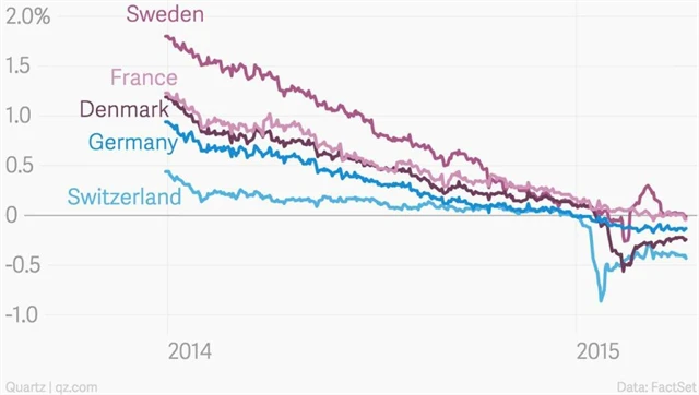 V některých případech jsou dokonce úroky nižší než nízké, jelikož se propadly pod nulu. Švýcarsko se mimo jiné minulý týden stalo historicky první zemí na světě, které se na trhu podařilo upsat 10leté vládní dluhopisy se záporným výnosem. Investoři, kteří se rozhodli Švýcarsku půjčit, tak za deset let nedostanou zpět ani celou částku, kterou do švýcarské státní kasy poslali. Záporné výnosy k vidění i u některých dluhopisů Německa, Dánska, Francie či Švédska.