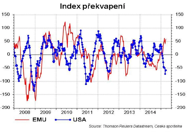Data o stavu ekonomiky USA jsou již několik měsíců spíše pod očekáváními ekonomů. Ukazuje to i známý index překvapení, tedy indikátor toho, jak údaje z ekonomiky překonávají odhady trhu. Od začátku roku nabraly USA "jižní" směr. Jde podle mě o standardní cyklický vývoj - dobrá data v roce 2014 vedla analytiky k přehodnocení prognóz nahoru, a to příliš. Vsadil bych se, že nás během pár měsíců čeká totéž, ale opačným směrem.