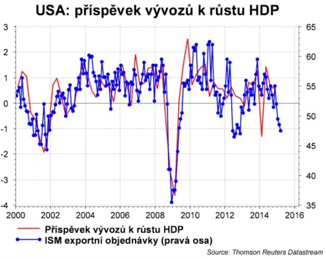 Pokles příspěvku vývozů k růstu HDP na úrovní mínus půl až jednoho procenta indikuje i dílčí index exportních objednávek ISM.
