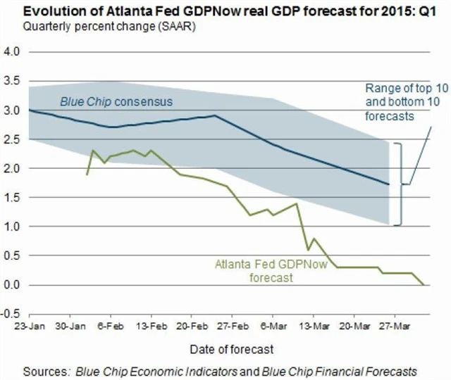 A na závěr GDPnow. Co to je? Jde o ukazatel Atlantského Fedu, který na základě zveřejňovaných dat odhaduje růst HDP v daném čtvrtletí. GDPnow nyní ukazuje, že růst HDP USA v 1Q2015 zpomalí na nulu.