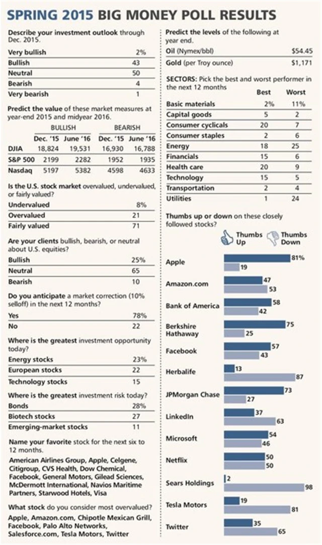 Aktuální vydání magazínu Barron's na své titulní straně odkazuje na svůj březnový průzkum mezi 143 americkými investičními manažery. Časopis se dvakrát ročně, na jaře a na podzim, ptá zástupců největších investičních společností, penzijních fondů i menších makléřských firem na to, jak se budou dále vyvíjet akciové a další trhy. Jak tedy dopadl jarní "Big Money poll"?