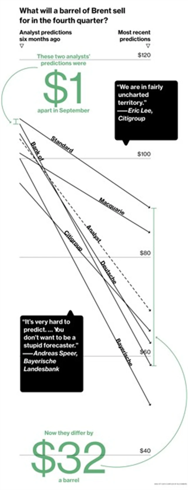 Nabídkový šok, Saúdská Arábie, severoamerické břidlice, OPEC, geopolitika (Írán a Blízký a Střední východ obecně, Rusko), rekordní zásoby v USA, zpomalující růst čínské ekonomiky a opatrný výhled růstu té globální. Faktorů, které tak či onak ovlivňují ceny ropy, je ještě daleko více. A analytici tak trochu házejí ručník do ringu. Tedy vlastně ne, každý zvlášť nějaký ten výhled nabízí, stejně jako trh s futures. Kolik ale bude stát ropa (na grafu od Bloombergu vztaženo na čtvrtý kvartál 2015), zkrátka nelze ani vytušit, analytici jsou na "cenové mapě" se svými odhady rozprostřeni nejvíce za posledních 8 let. Zapojíte se do tipovací hry?