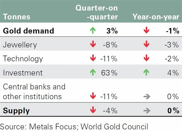 V prvním čtvrtletí poptávka po zlatě klesla meziročně o 1 %, tedy necelých 11 tun.