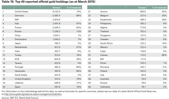 Centrální banky jako celek ale opět zlato dokupovaly. Sice nelze bez hlubší analýzy říci, ve kterých konkrétních trezorech je ho nejvíce (vzpomeňme jen na kauzu repatriace německého zlata z USA), majitelé největšího množství zlata se ale do tabulky dají nasázet bez problémů.