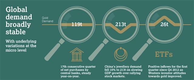 Rozdíly napříč regiony a jednotlivými sektory trhu však byly výrazné. Například poptávka ze šperkařského průmyslu sice rostla v USA, Indii a na některých menších trzích jihovýchodní Asie, pokles ale nahlásily Čína (poptávka tamních šperkařů v 1Q2014 byla ale rekordní), Turecko, Rusko a Střední východ.