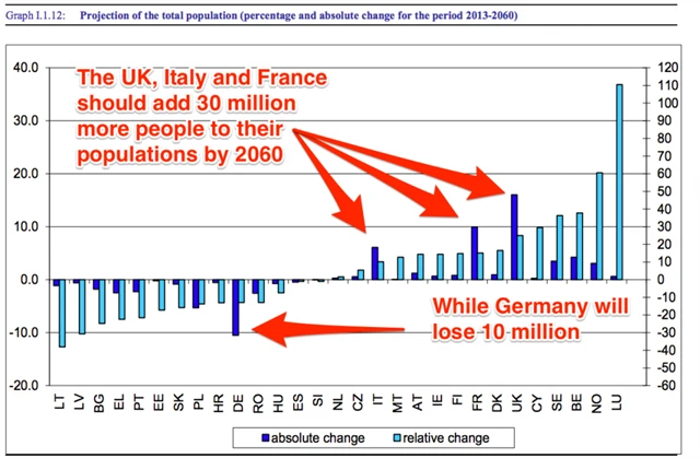 Tmavě modré sloupečky v grafu značí očekávaný přírůstek nebo úbytek obyvatel jednotlivých členských zemí EU. Podle EU bude mít Německo do roku 2060 o 10 milionů méně obyvatel než nyní. Ve stejném období by v Itálii a Francii mělo přibýt 5 milionů, respektive 10 milionů lidí. Není to rychlý růst, ale stále jde o naprosto odlišný trend než v Německu. Z velkých ekonomik má podle Evropské komise nejmenší demografické problémy Spojené království, počet obyvatel by tam měl vzrůst o 15 milionů.