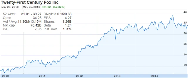 Už druhé čtvrtletí v řadě navýšila Berkshire svůj podíl v Twenty-First Century Fox, a to značně. Býčí trend akcií společnosti nyní možná není tolik patrný jako ve čtvrtém čtvrtletí 2014, kdy Buffett nakoupil 4,7 milionu akcií firmy. I tak nákup dalších 1,5 milionu akcií znamenal oproti předchozímu čtvrtletí navýšení pozice o 31 %.