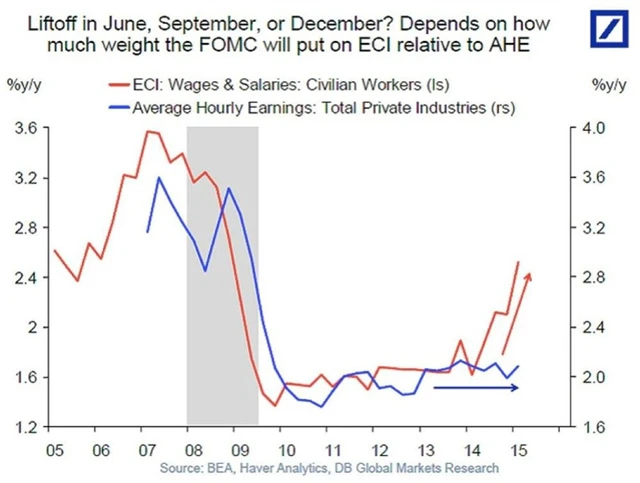 Ekonom Torsten Sløk z Deutsche Bank do nedávné poznámky klientům vložil graf, který podle něj ilustruje, jak asi vypadá rozhodování Fedu o načasování růstu sazeb. Graf srovnává vývoj nákladů na práci s vývojem průměrné hodinové mzdy v USA.