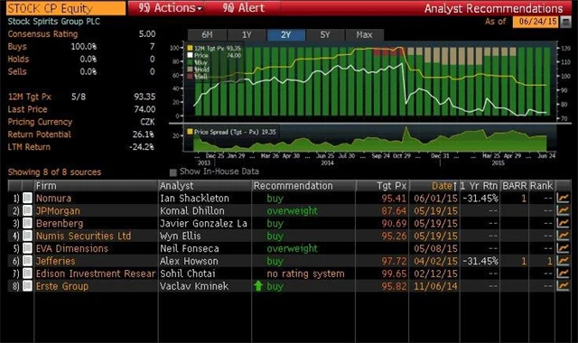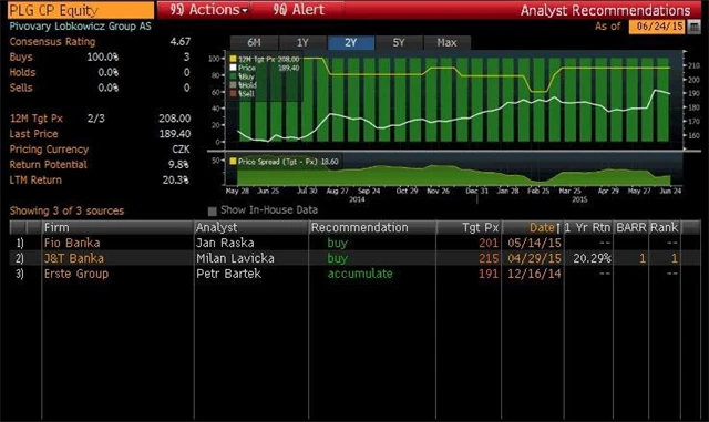 Jaký názor mají na akcie Pivovary Lobkowicz Group a Stock Spirits domácí a zahraniční analytici? Jaké jsou jejich dvanáctiměsíční cílové ceny a jak znějí jejich aktuální investiční doporučení? Nabízíme jejich přehled, jak jej k 24. 6. 2015 shromáždila agentura Bloomberg.