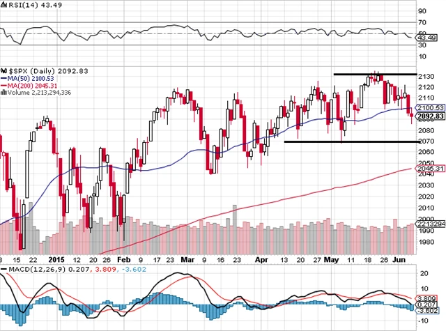 Index S&P 500 se obchoduje v dlouhodobém rozpětí 2 070 až 2 135. Silný signál pro další vývoj přijde až s prolomením těchto hranic, index se může bahnit do strany klidně i celé léto.