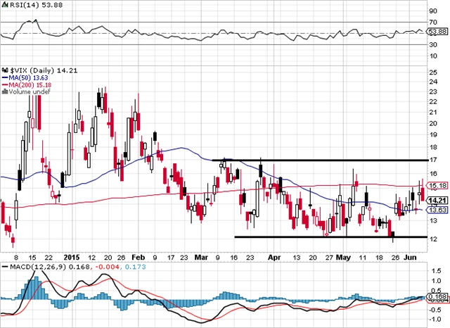 Index volatility VIX se drží v polovině rozpětí 12-17. Rostoucí trend se zatím neformuje, což je pro akcie dobrá zpráva.