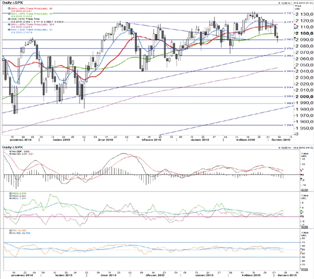 Index spadl pod květnové lokální minimum. MACD se blíží půlročnímu minimu. Obě ROC jsou v mínusu. RSI je v negativním pásmu pod 50 body.