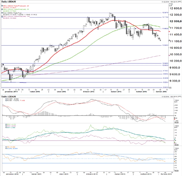 Technické indikátory jsou celkově negativní. Očekáváme, že index bude v následujících dnech ztrácet. Nejbližší úroveň podpory je okolo 10 907 bodů.