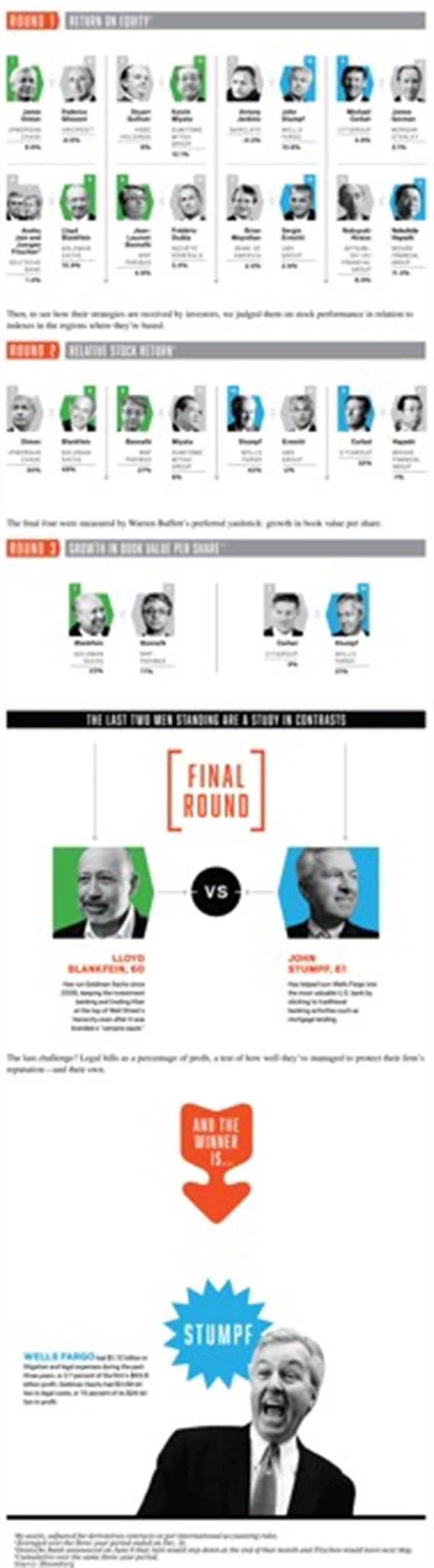 Ve finále se o titul nejlepšího manažera ve finančním sektoru utkali Lloyd Blankfein z Goldman Sachs a John Stumpf z Wells Fargo. Hodnotícím kritériem byl poměr výdajů na urovnání sporů ohledně nekalých praktik banky k celkovému zisku. Vítězství editoři přiřkli jednašedesátiletému šéfovi americké banky Wells Fargo Johnu Stumpfovi, který z tohoto finančního domu udělal nejhodnotnější banku ve Spojených státech.