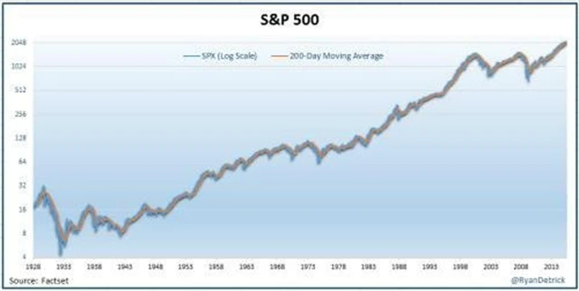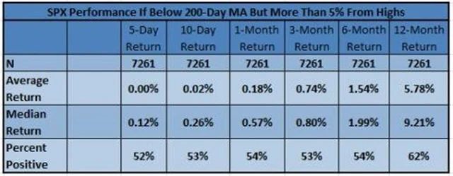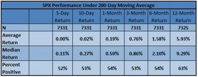 Michael Batnick na webu Irrelevant Investor popsal, co se děje, když cena spadne pod 200denní klouzavý průměr. A děje se toho hodně - 22 z 25 nejhorších obchodních dnů od roku 1960 nastalo právě v době, kdy byla cena pod 200denním klouzavým průměrem. Za posledních 55 let se 83 ze 100 nejhorších dnů rovněž odehrálo v době, kdy byla cena pod tímto klouzavým průměrem.