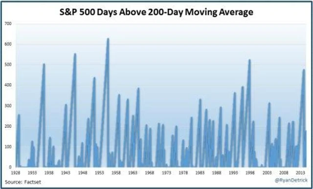 Jak dlouho se index S&P 500 obvykle drží nad hranicí 200denního klouzavého průměru? I když se 178 dnů zdálo jako hodně, v historii najdeme několik delších období.
