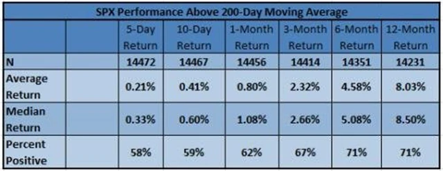Jak se indexu S&P 500 dařilo, když se držel nad hranicí 200denního klouzavého průměru? Data jdou v historii až do roku 1928.