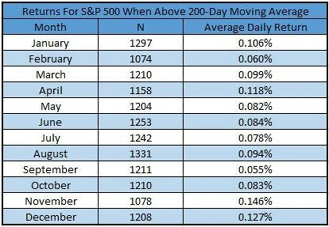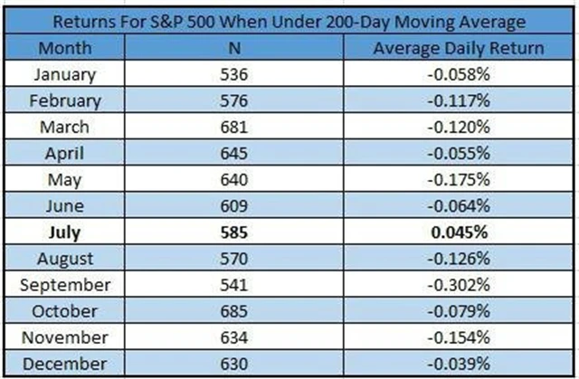 Když se index nachází pod 200denním klouzavým průměrem, pouze v červenci mají investoři šanci na dosažení kladného výnosu. Podle aktuálního oživení na trhu se zdá, že to může platit i letos.