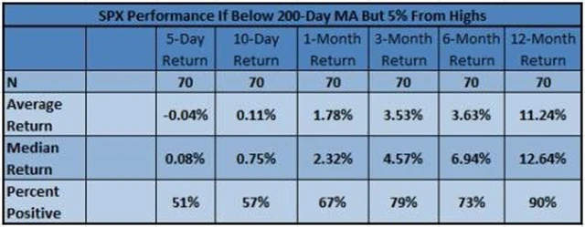 Je zajímavé, že byl index S&P 500 9. července pouze 3,94 % pod svým historickým maximem a zároveň pod 200denním klouzavým průměrem. Situace, kdy byl index pod tímto klouzavým průměrem a ještě blíže k historickému maximu, nastala od roku 1928 pouze jednou, a to v říjnu 1992. Situace, kdy byl S&P 500 pod zmiňovaným klouzavým průměrem a zároveň méně než 5 % od historického maxima, nastala pouze 70krát.