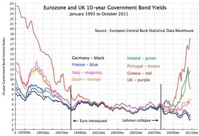 Před přijetím jednotné evropské měny investoři Řecko vnímali jako středně velkou ekonomiku s nepříliš dobrými politickými základy. To se zrcadlilo i v úvěrovém profilu této jihoevropské země. Trh považoval půjčování peněz Aténám za poměrně rizikovou záležitost, což dobře ilustruje graf vývoje výnosů řeckých bondů. Dokud bylo euro jen vizí, Řecko si půjčovalo i za více než 20 %, jakmile se ale projekt jednotné evropské měny stal realitou, sjednotily se výnosy méně kvalitních řeckých dluhopisů s výnosy dluhopisů zemí jako Německo nebo Spojené království.