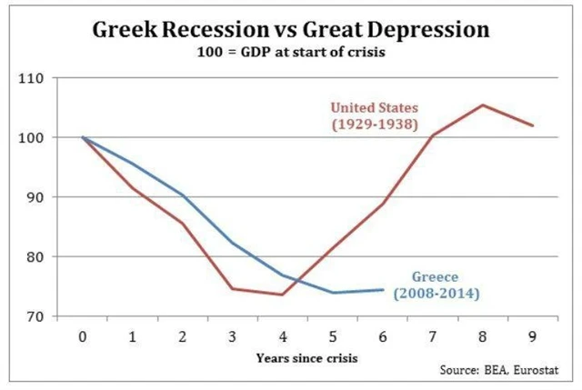 Dopady dluhové krize na ekonomiku Řecka jsou podle nové studie American Enterprise Institute dokonce horší než důsledky Velké hospodářské krize. "Řecko si v posledních šesti letech prošlo velmi silnou depresí, která byla stejná nebo ještě horší než to, čím si ve 30. letech prošly Spojené státy. Ekonomika země se propadla zhruba o čtvrtinu, míra nezaměstnanosti vyskočila nad 25 % a nezaměstnanost mladých překročila kritickou úroveň 50 %," píše se ve zprávě American Enterprise Institute. "Během té doby navíc dále rostlo zadlužení země, a to i přes všechna úsporná opatření, která měla mít opačný efekt, což stav řecké ekonomiky ještě zhoršilo."
