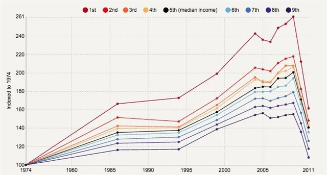 Dluhová krize se tvrdě podepsala i na mzdách. Od roku 2009 se výrazně propadly mzdy všech příjmových skupin a reálné mzdy se dostaly zhruba na úrovně, na nichž se nacházely v 70. či 80. letech minulého století.