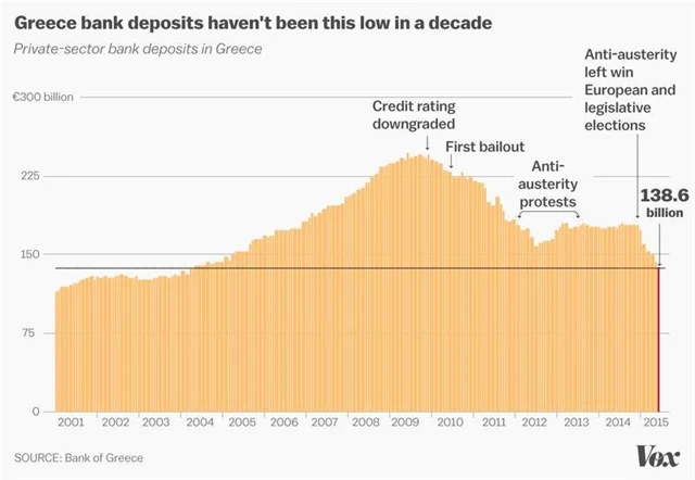 Obavy z budoucnosti silně zadlužené země samozřejmě nezůstaly bez odezvy ani ve finančním sektoru. Jedním z nejčerstvějších symbolů krize jsou banky v obležení. Obavy Řeků o úspory v bankách, které začaly eskalovat poté, co na konci června vše ukazovalo na to, že si Řecko postaví hlavu a odejde z eurozóny, vyústily až v nutnost uzavření bank a zavedení kapitálových kontrol, což fronty u bankovních překážek změnilo v tlačenice před bankomaty, z nichž mohou Řekové zhruba měsíc vybírat jen 60 eur na den, respektive 420 eur na týden.
