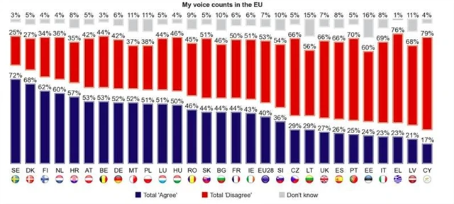Frustrace Řeků je jen těžko představitelná. Z loňského průzkumu Evropské komise vyplynulo, že si jen 23 % Řeků myslí, že má slovo Atén v Evropské unii nějakou váhu, zatímco naopak 76 % dotázaných v průzkumu uvedlo, že Řecku v EU nikdo nenaslouchá. Skeptičtější než Řekové už jsou pouze Lotyši a Kypřané.