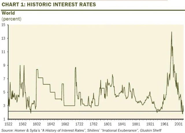 Dokonale to ilustruje graf, který letos ve svých analýzách několikrát použil David Rosenberg z Gluskin Sheff. "Pouze v 70. letech 16. století a 30. letech 20. století byly globální výnosy tak nízké jako v posledních letech," upozorňuje ekonom.
