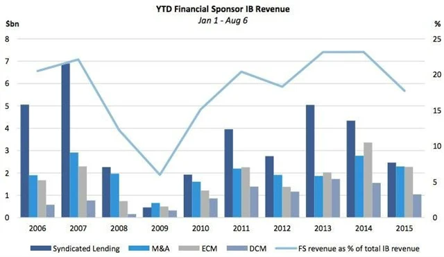 Poplatky placené fondy private equity tvoří poměrně velkou část příjmů investičních bank. Například loni touto dobou tvořily tyto poplatky čtvrtinu příjmů investičních bank. Letos, zejména kvůli těsnější regulaci a akciovým trhům na vrcholu, je aktivita v tomto segmentu výrazně utlumená. Podle údajů firmy Dealogic klesly příjmy od private equity firem až o třetinu.