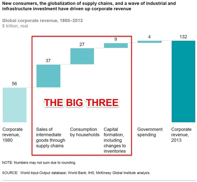 Zisky vzrostly z 2 bilionů USD (7,6 % světového růstu) v roce 1980 na 7,2 bilionu USD (9,8 % HDP) v roce 2013. Růst mají na svědomí tři faktory: