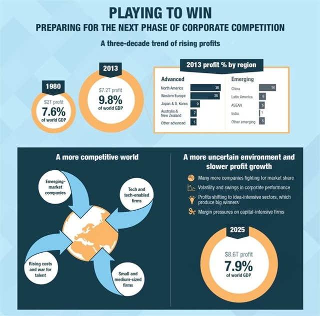 "V posledních třech desetiletích korporace zaznamenaly rekordní růst zisků, příliv nových tržních příležitostí a pokles nákladů. Možná je ale tomu všemu konec. Noví tržní hráči dávají lídrům odvětví najevo, že se podnikatelské prostředí mění na nejisté a extrémně konkurenční," tvrdí MGI ve svém reportu Playing to Win: The new global competition for corporate profits.