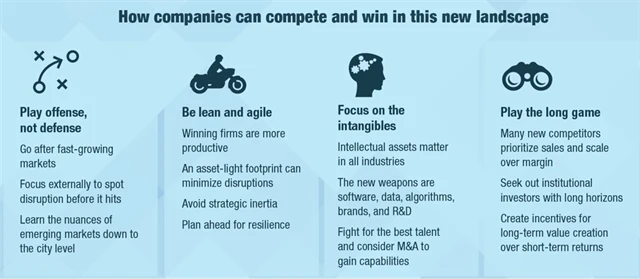 - Na druhé straně jsou hi-tech firmy, které představují nové obchodní modely a pronikají do nových sektorů. A technologické korporace nejsou jedinou hrozbou. Silné digitální společnosti jako Alibaba a Amazon slouží jako pomocné platformy pro tisícovky malých a středních podniků. Ty díky nim získávají vliv a zdroje a útočí na větší firmy.