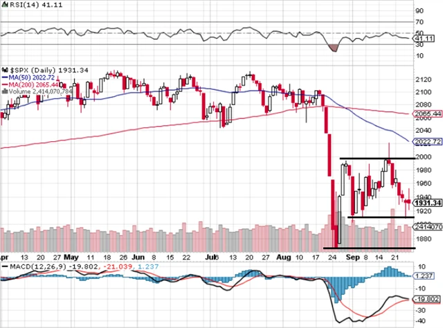 Index S&P 500 odepsal v týdnu 1,36 %. Jeho nastavení je negativní. Zůstává v rozpětí 1 870 až 1 990 nebo 2 000. Pozitivní je to, že se ve čtvrtek po prudkém propadu k supportu v zóně 1 900 odrazil výše.