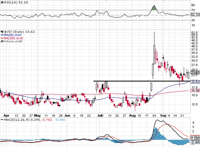 Index volatility VIX zůstává nad historickým průměrem 20 a pro akciový trh vysílá medvědí signál.