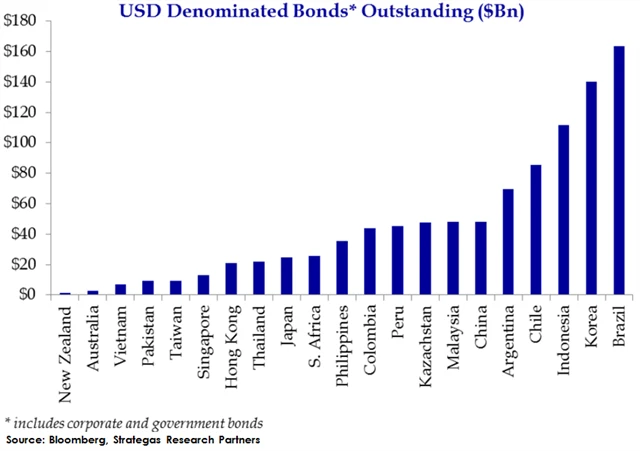 Důležitý faktor pro investory, ale hlavně pro samotné země. Nezřídka si totiž v době, kdy byl americký dolar výrazně slabší, napůjčovaly právě v americké měně. Nyní je pro ně posilování dolaru (z důvodu relativně silné americké ekonomiky a potenciálnímu zvyšování sazeb v USA) velkou hrozbou. Které země mají v dolarech půjčeno nejvíce?