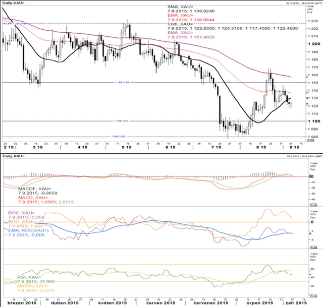 Cena zlata testuje 20denní klouzavý průměr. MACD stagnuje těsně nad nulou. ROC20 kolísá nad nulou a ROC50 pod nulou. RSI klesl pod neutrální úroveň. Měl by pokračovat pokles k hladině 1 100 USD.