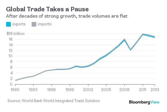 Reformy a technologické inovace v průběhu 90. let snížily náklady. Zároveň měly podstatný vliv na celosvětový obchod tím, že podporovaly rozvíjející se trhy v začlenění se do globální ekonomiky, a tím, že pomohly k vytvoření a udržitelnosti globálních ekonomických řetězců. Výsledkem byl růst globálního obchodu v poměru k HDP. Protože je ale tento proces z velké části dokončen, zásadní podněty k rozšíření obchodu jsou nyní mnohem slabší než v minulých desetiletích. Svět je tedy ve stavu, kdy obchod neklesá, ale ani neroste v poměru k HDP.
