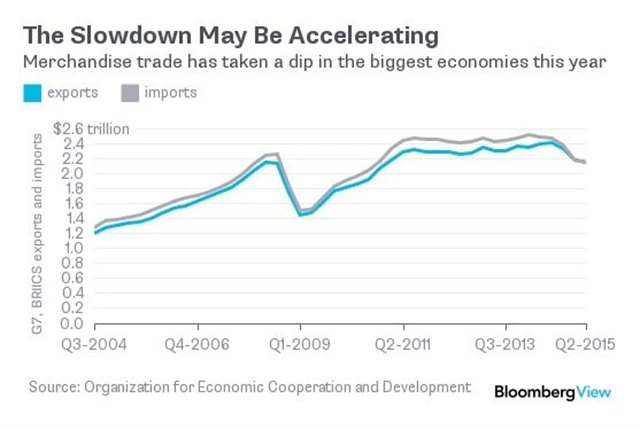 Nejjednodušším způsobem, jak si tato podezření potvrdit, je ukázat si je na grafech. Po velkolepém nárůstu objemu obchodu na začátku tisíciletí přišlo po roce 2008 vystřízlivění v podobě finanční krize a pokles. Po zotavení přišlo další zpomalení v roce 2013. Podle aktuálních údajů ze zemí G7 a BRIICS (kromě BRIC také Indonésie a JAR) se zdá, že tento pokles opět nabírá na síle.