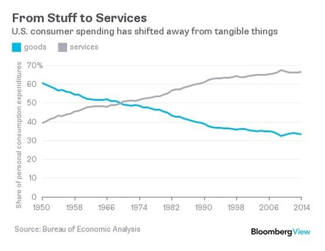 Posledním příkladem změny spotřebitelského chování je věc, která je nyní nejvíce v kurzu. Mohou to být smartphony. Přestože i k jejich výrobě jsou potřebné nerostné suroviny a zdroje, co do objemu se automobilům určitě nevyrovnají. Většina hodnoty smartphonu je ukryta v jeho softwaru, což je diametrálně odlišný způsob vytváření hodnoty, než tomu bylo ve 20. století. Pokud je to nový směr, kterým se světová ekonomika vydá, vztahy mezi růstem, obchodem a využíváním přírodních zdrojů se rovněž diametrálně změní. A to je možná dobře.