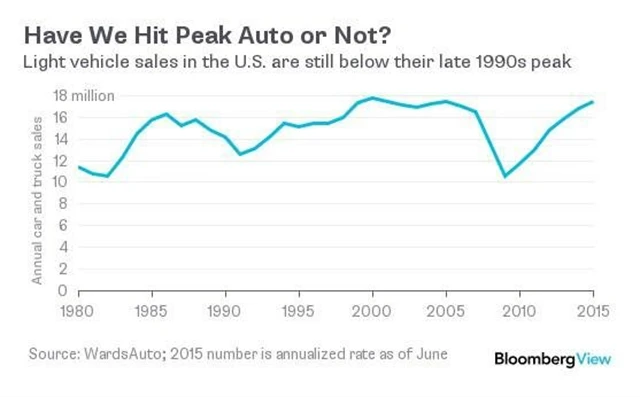 I když ani to neplatí úplně. V posledních 65 letech prodělala americká ekonomika jednu velmi výraznou změnu. I když jsou lidé schopni pořídit si mnohem více zboží než v roce 1950, jsou patrné určité známky stagnace. Příkladem jsou automobily, pro USA typický produkt. Navzdory růstu populace nejsou roční přírůstky prodejů výrazné.