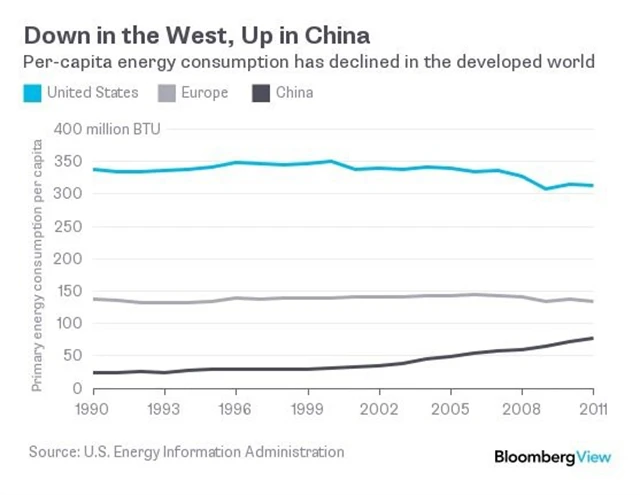 Ještě výmluvnější je spotřeba energie. Američané spotřebovávají mnohem méně energie než v 90. letech. Křivka Evropy v grafu je ovlivněna vstupem východoevropských zemí do globální ekonomiky v 90. letech, což znamenalo zvýšení energetické náročnosti. Rozdíl mezi kontinenty je však známkou toho, že USA mají pravděpodobně ještě velký prostor k omezení spotřeby energie. Rychlý čínský růst pak stojí za globálním boomem na poli přírodních zdrojů, který momentálně také zpomaluje.