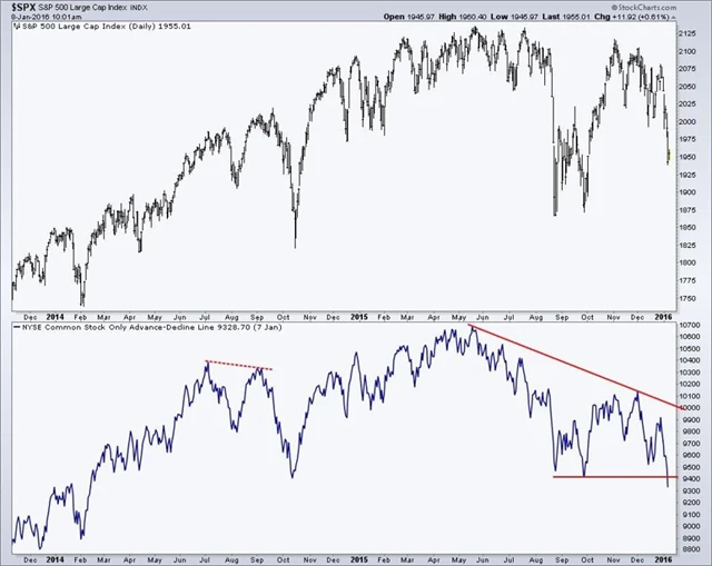 O pár dní později Thrasher upozornil na graf NYSE Common Stock-Only Advance-Decline Line, který ukazuje, kolik akcií se podílí na aktuálním trendu. Čím více akcií posiluje, tím výše index roste. Výprodeje na amerických akciových trzích na přelomu loňského a letošního roku poslaly tento ukazatel pod srpnová lokální minima, zatímco S&P 500 stále zůstává výše než v srpnu. A to nevěstí nic dobrého.