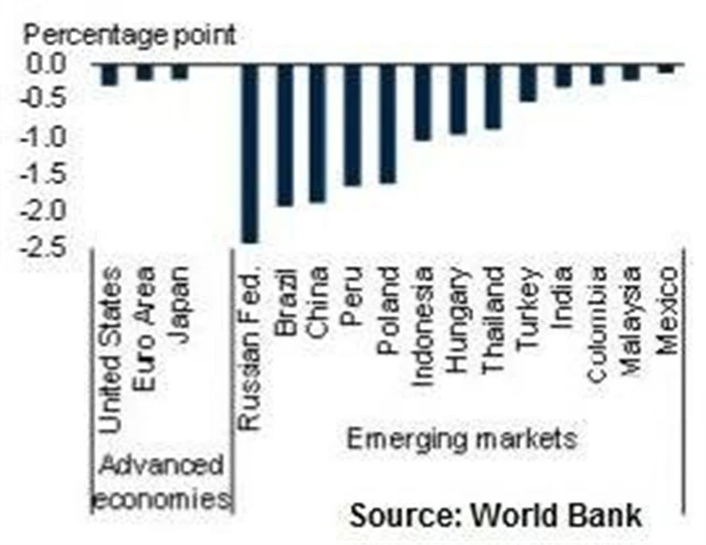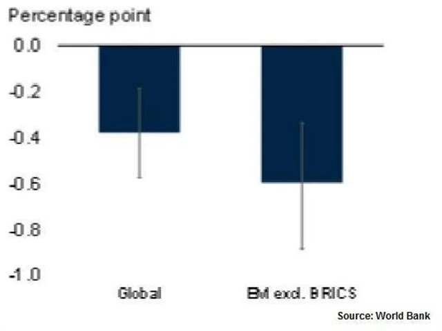 Rozvíjející se trhy v současnosti tvoří mnohem větší část koláče světové ekonomiky, než tomu bylo v minulosti. Země BRICS (Brazílie, Rusko, Indie, Čína, JAR) tvoří 25 % světového hrubého produktu, na začátku tisíciletí to bylo jen asi 8 %. Podle Světové banky tak může pokles růstu HDP v zemích BRICS o jeden procentní bod způsobit pokles o 0,8 procentního bodu v ostatních rozvíjejících se zemích a 0,4 bodu globálně. "Naznačuje to nemalé riziko možné nákazy prostřednictvím ostatních rozvíjejících se trhů a potenciální nežádoucí účinky také na rozvinuté ekonomiky," myslí si Světová banka.