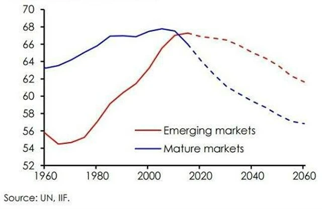 Část problému tkví v tom, že pracovní síla neroste podle očekávání, v případě Číny se dokonce zmenšuje. Dosavadní politika jednoho dítěte znamená, že vlna starších zaměstnanců odcházejících do důchodu není nahrazována dostatečným počtem mladších lidí. Ale i ostatní rozvíjející se trhy poměrně rychle stárnou. Kromě toho, že to vytváří velké závazky do budoucna, zhoršuje to růstový potenciál. Rozvojové země tak čelí, stejně jako ty bohaté a rozvinuté, úbytku pracovní síly. "Budování institucí a reformy nejsou v souladu s růstem HDP a výsledný nesoulad bude pro mnoho rozvíjejících se trhů znamenat výzvy k překonání problémů spojených s předčasným stárnutím," tvrdí Ústav pro mezinárodní finance (IIF).