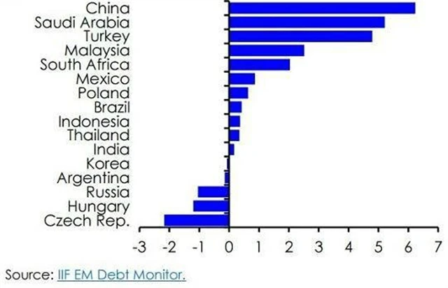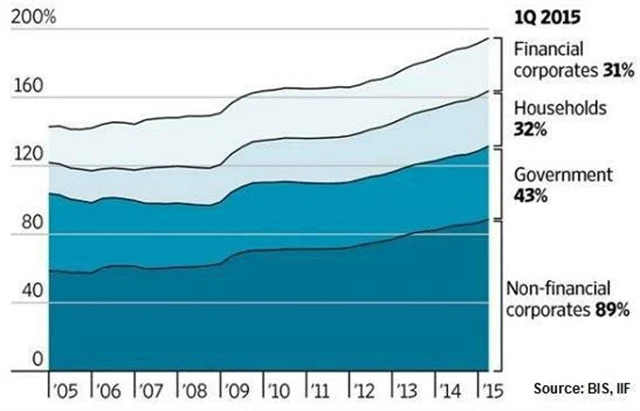 I přes opakovaná varování před nebezpečným růstem úrovně dluhu se některé země nadále zadlužují. Zadlužení čínských nefinančních podniků vzrostlo od konce roku 2014 do poloviny loňského roku o zhruba sedm procentních bodů (vůči HDP).