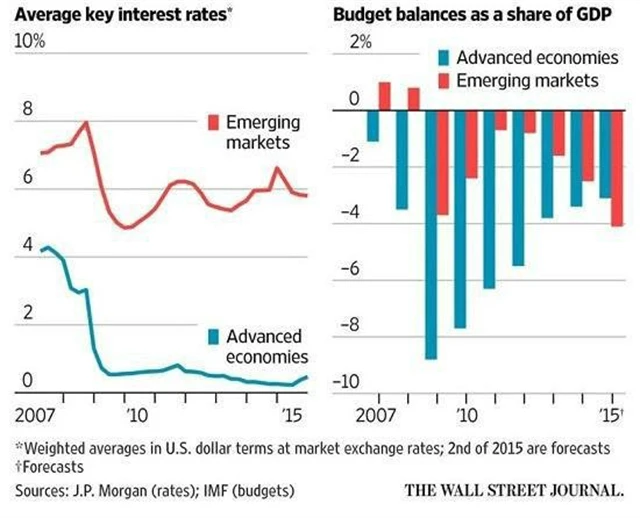 Politický arzenál pro stimulaci růstu je rovněž na minimu. Před finanční krizí zaznamenávaly rozvíjející se země rozpočtové přebytky, ale dnes mají průměrný schodek na úrovni 4 % HDP. Ke snižování úrokových sazeb již také nezbývá prostor.