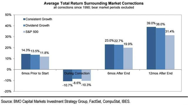 Své tvrzení doplňují grafem, v němž jsou zobrazeny výnosy v dobách korekcí podobných té současné. Index S&P 500 v následujících šesti měsících po korekci dosahoval průměrného zisku 19,9 % a po roce od korekce to bylo 31,4 %.